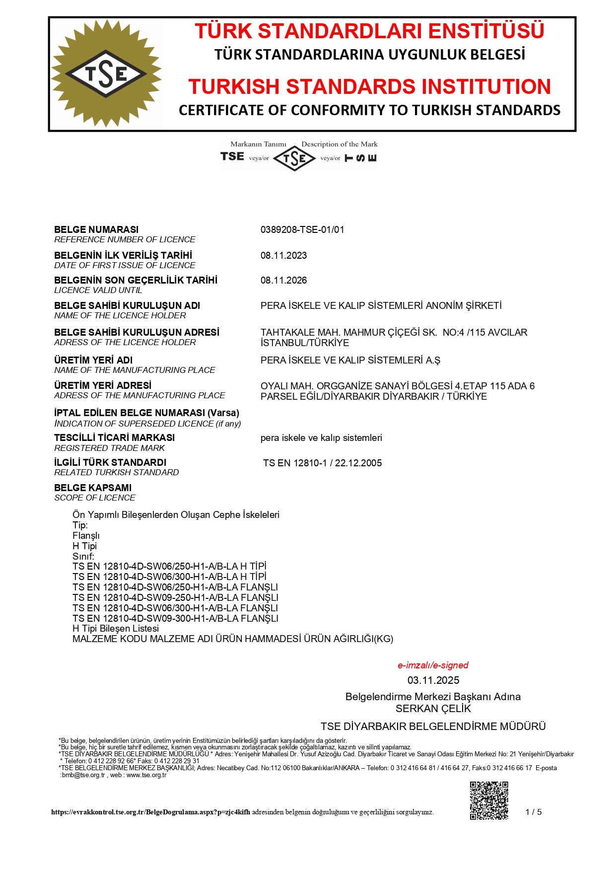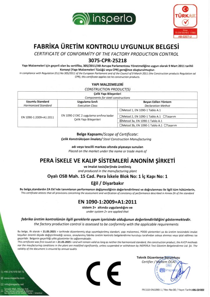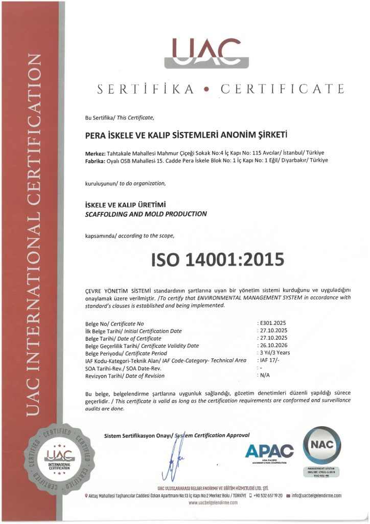 Şirketimizin çelik kalıp ve iskele imalat faaliyetleri ile ilgili olarak; Türk Standartları Enstitüsü (TSE) TS EN 12810-1 / 22.12.2015 Türk Standartlarına Uygunluk Belgesi, ISO-9001:2015 Kalite Yönetim Sistemi, ISO-14001:2015 Çevre Yönetim Sistemi, EN 1090-1:2009+A1:2011 Avrupa Parlamentosu Yapı Ürünleri Yönetmeliği (CPR) CE standartlarına göre Fabrika Üretim Kontrolü Uygunluk Belgesi, EN ISO 3834-2 Metalik Malzemelerin Ergitme Kaynağı için Kalite Şartları ve Standartları Kalite Yönetim Sistemi sertifikaları mevcuttur.